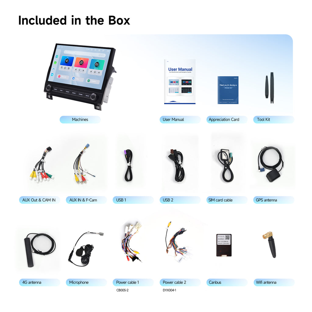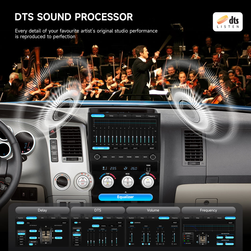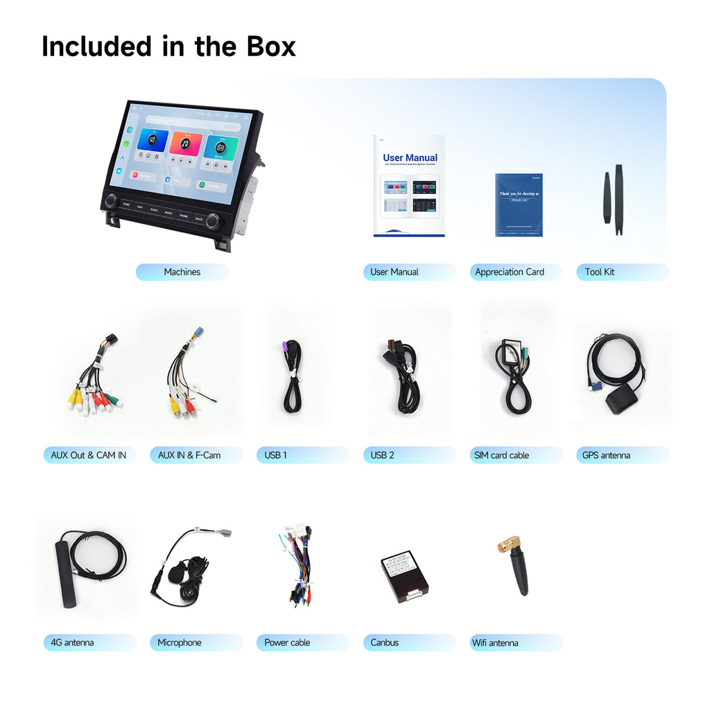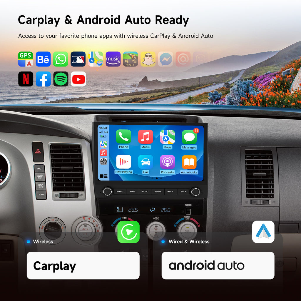 Upgrade your Toyota 2nd Gen Tundra (2007-2022) or Sequoia (2014-2022) with this plug-and-play car stereo. Includes everything you need: Plug & Play harness, Canbus, and full compatibility with Factory Steering Wheel Controls, Factory JBL system,Backup Camera, A/C Info, Radar, Door Alerts, AUX, and USB. No hassle, just plug it in and hit the road!