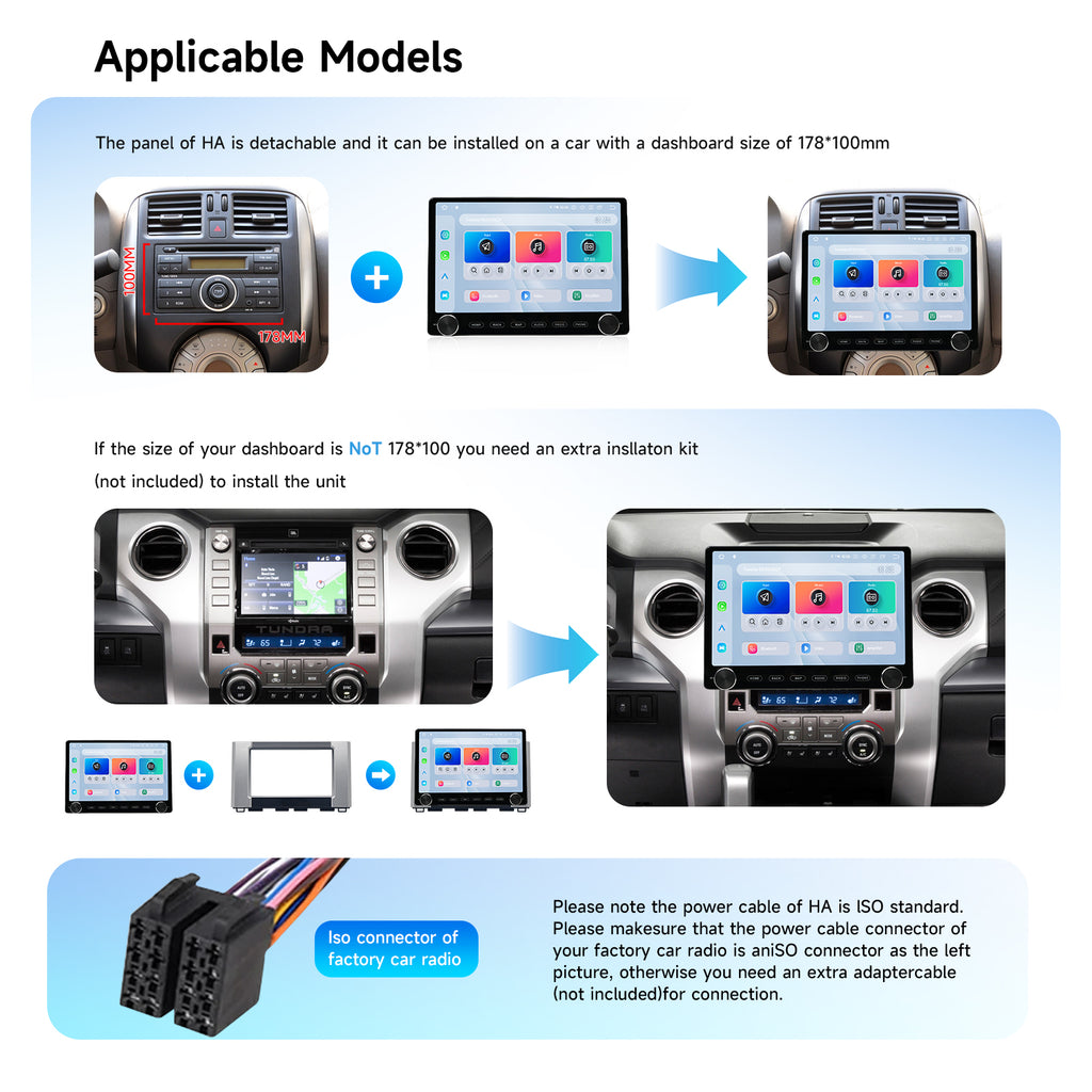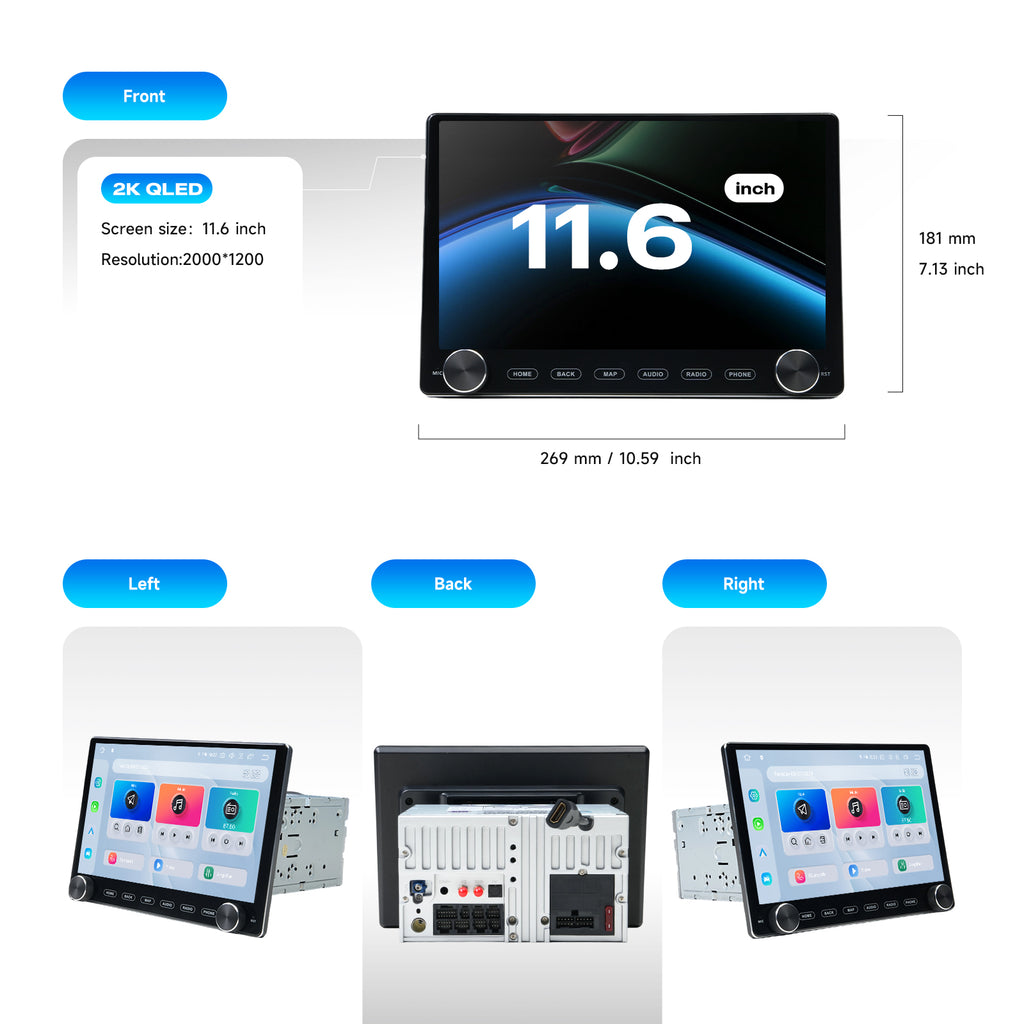 This 11.6" Double DIN universal car stereo is designed to fit vehicles with a standard factory radio opening size of 178mm x 100mm. It delivers a modern touchscreen upgrade with a clean factory-style look and improved functionality.
